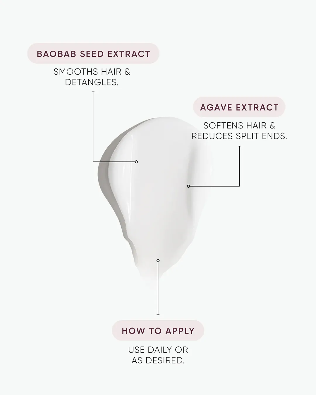 Signature Formula: A daily leave-in moisturising crème, with Baobab Seed and Agave Leaf Extract to smooth and soften hair. Enriched with our Signature Peptides and Ectoin Barrier Booster that assist to repair and strengthen, nurturing the scalp microbiome for your healthiest hair.